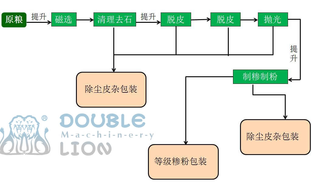 主要设备:组合清粮机,砂辊脱皮机,铁辊脱皮抛光机,超精制粉机,超精制糁机,刷粉机
